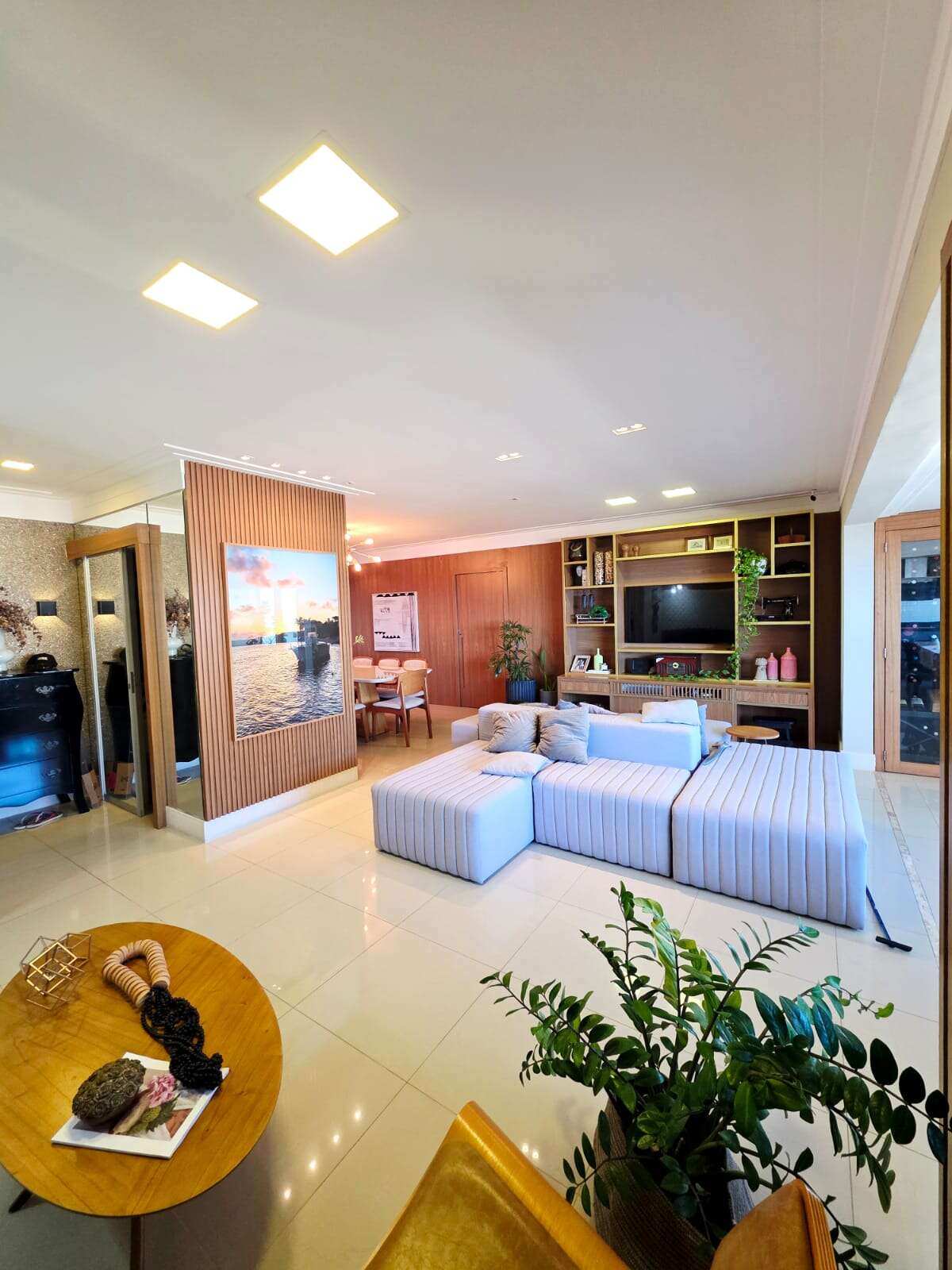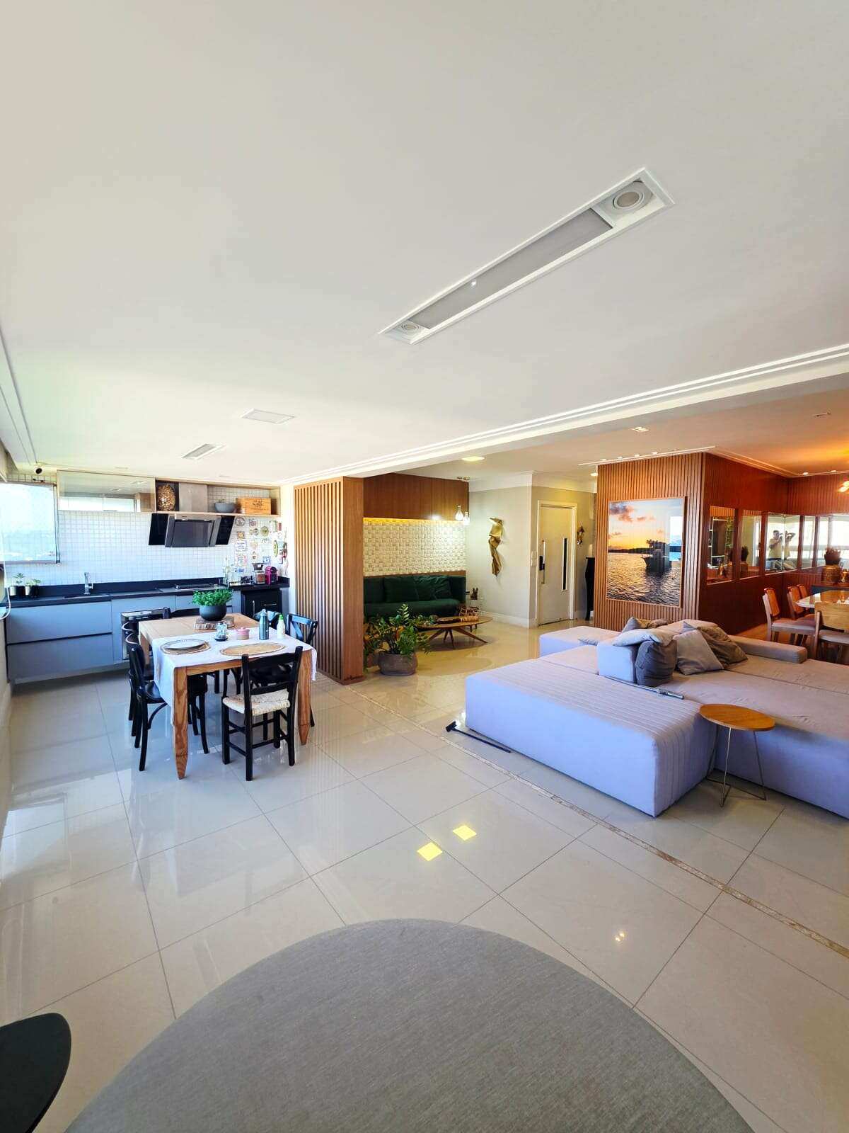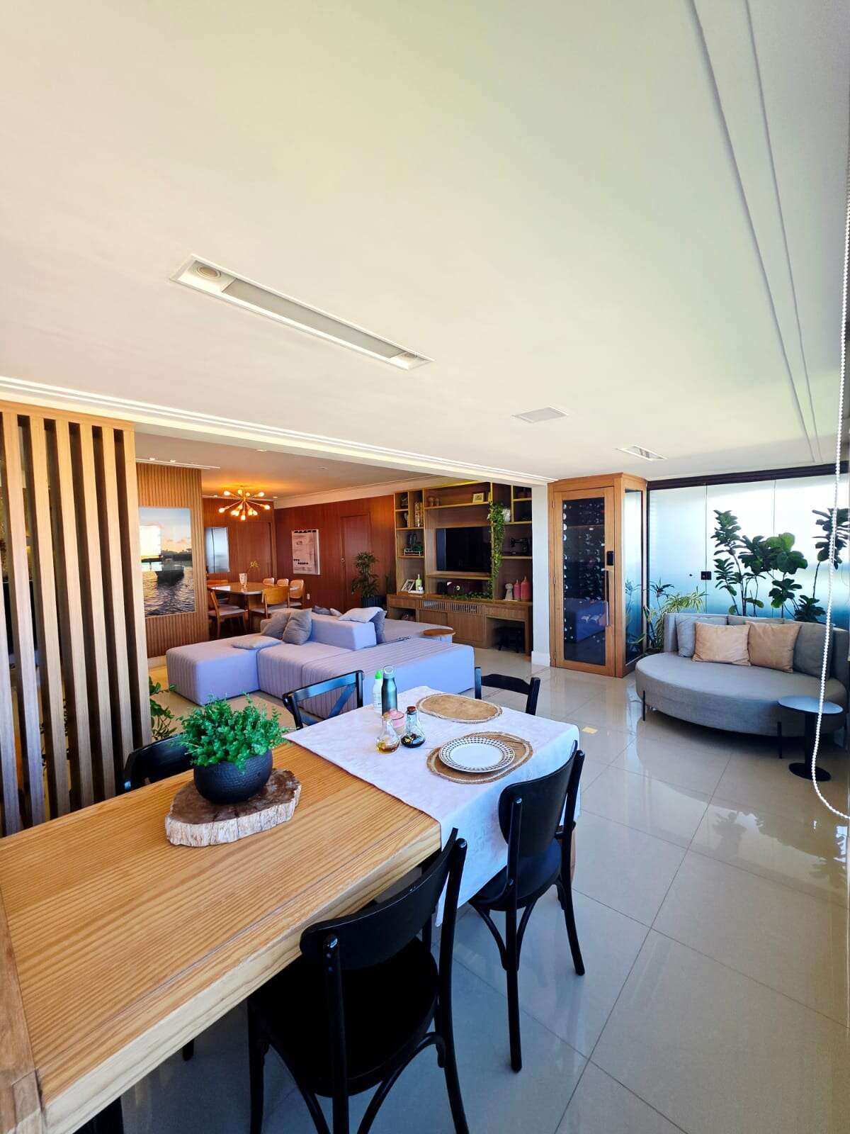 Sala ampla em vários ambientes com varanda integrada