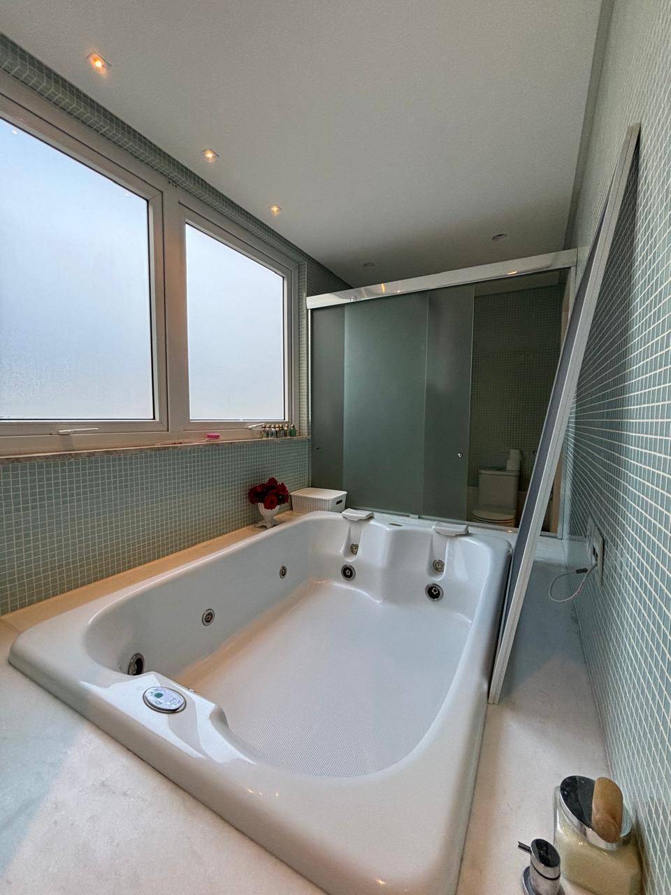 Varanda com banheira de hidromassagem com vista área verde