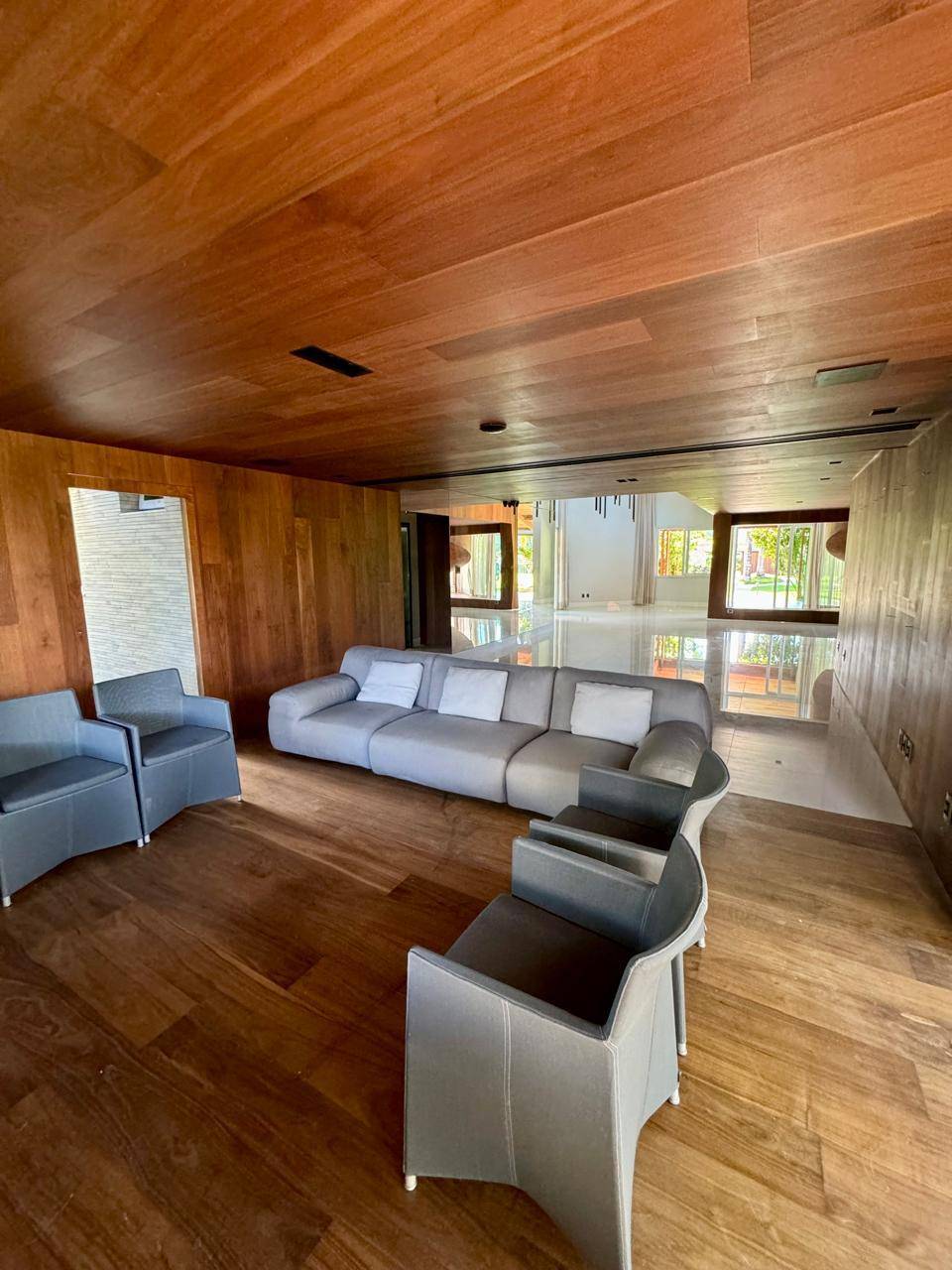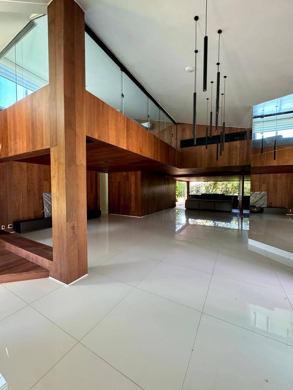 Sala ampla em vários ambientes com pé direito elevado