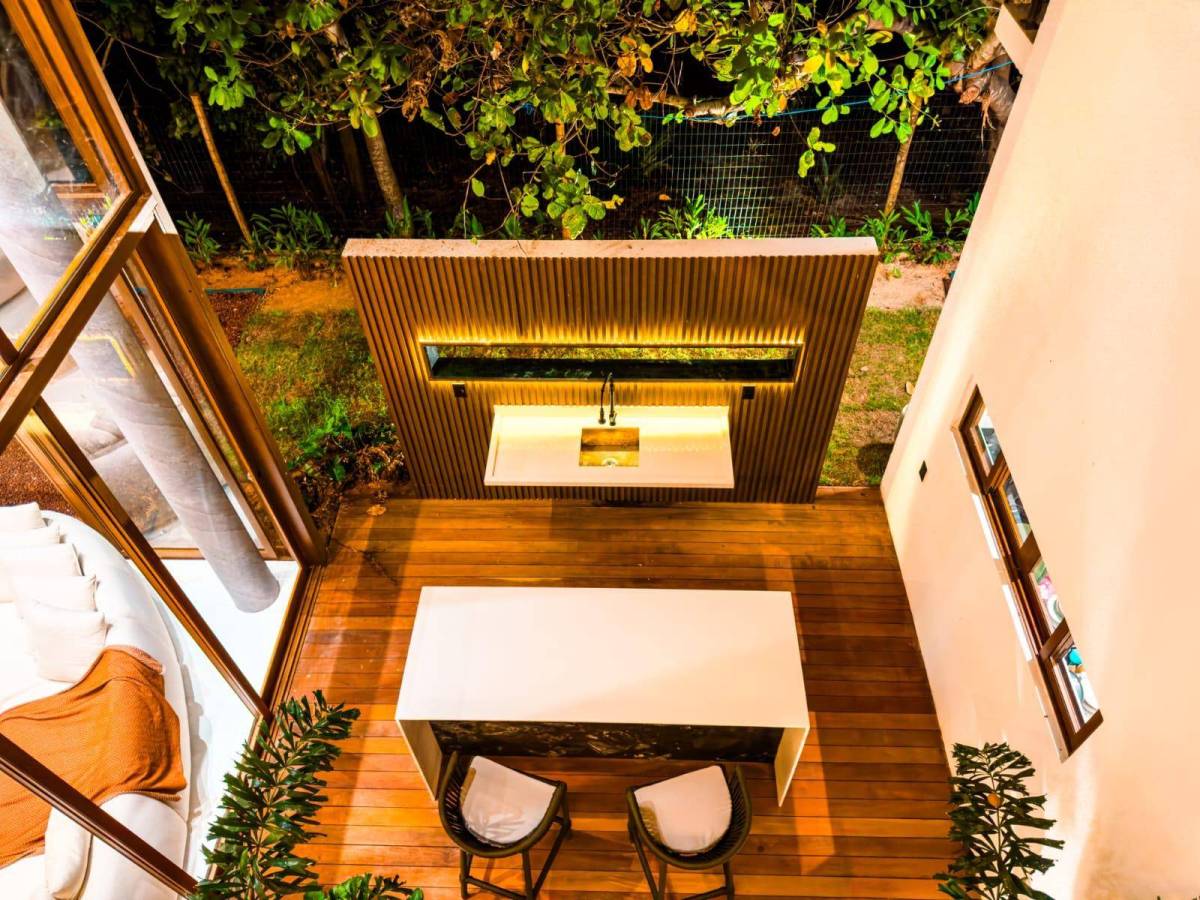 Área gourmet finamente decorada e pergolado externo