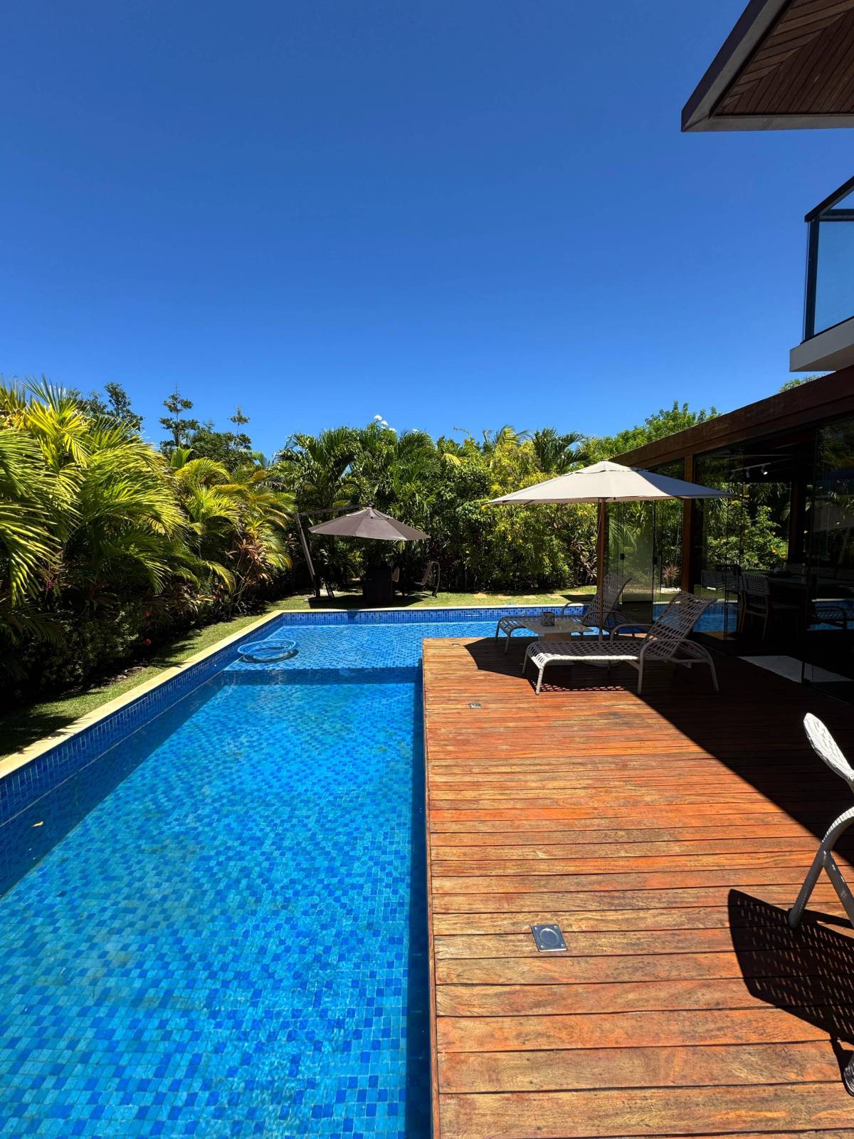 Piscina com grande deck, raia, hidromassagem, parte infantil, etc.